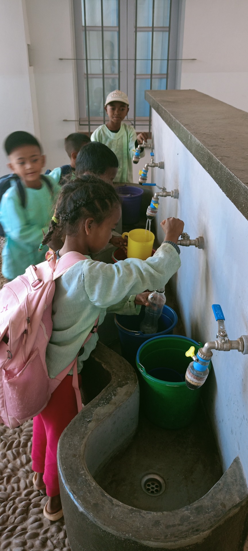 Nye vannposter og innlagt vann er en stor forbedring. Barna tar med egne drikkeflasker hjemmefra og fyller dem før timene.